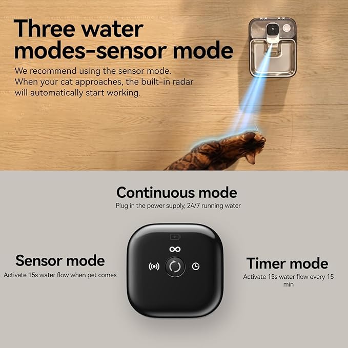 - [Three Water Modes]This wireless cat water fountain offers three working modes. Sensor mode supplies water for 15 seconds when your pet approaches within 59 inches. Timer mode has water flow every 15 minutes for 15 seconds. Continuous mode provides 24/7 running water when plugged in. We recommend sensor mode for power conservation.