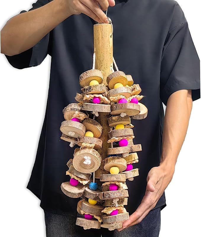 - PERFECT SIZE FOR LARGE& MEDIUM PARROT - Our parrot toys for large birds measures 19.7" with colorful wood block, Suitable for finch, budgie, love birds, parakeets, macaw, conures and African grey, cockatoos.