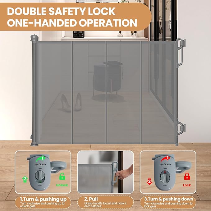 - 【Reinforced Safety Upgrade】 <1>The upgraded reinforced Retractable Baby Gates has three reinforced rods. Stronger and less prone to deformation. Prevent the top grid from sagging, deforming, and the bottom from lifting. Prevent babies and pets from crawling under gates. <2>Retractable baby gate featured with double locking mechanism creates a safety home for your curious crawlers and keep them away from danger, providing a safe, closed off environment to play.