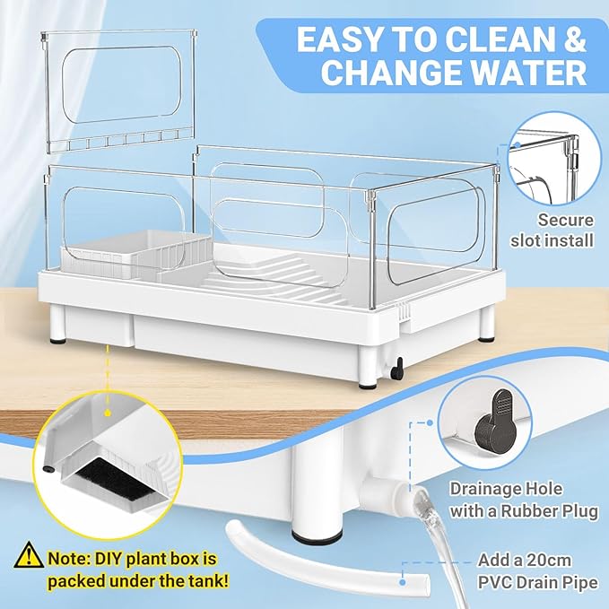 - 【EASY TO USE AND CLEAN】Keep your turtle tank clean and hassle-free with bottom drainage feature. Simply drain the water, remove debris, and refill for a healthier habitat. There is a DIY plant box is packed under the tank, you can use our included colored stones and trees to decor the landscape of the turtle aquarium.