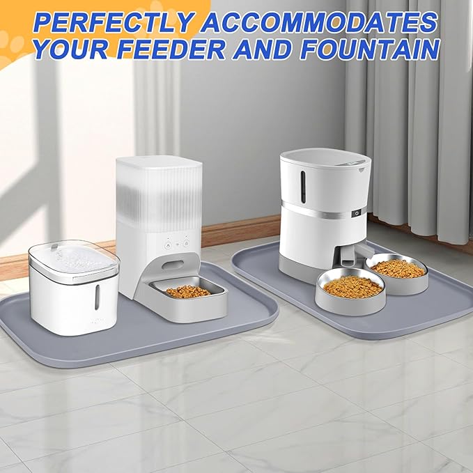 - Widely Used - The anti slip dog food spill mat with high sides can also be used under pet water fountain, automatic feeder, and litter boxes to help contain messes and protect floors. Use as boot mat, shoe matt tray for entryway, pet water splash mat, dog water bowl drip pan. Can also be used for dog crate, trash can, pet water dispenser, countertop, plant, fish tank.
