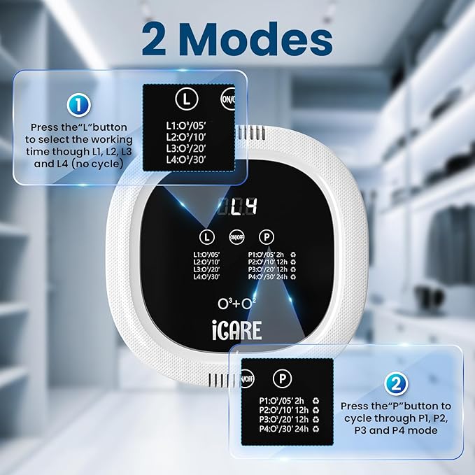 - Ionizer Air Purifier with 2 Modes: When ozone air purifier is turned on, press the "L" button to select the working time through L1, L2, L3, and L4 (no cycle). Press the "P" button to switch between modes P1, P2, P3, and P4. The ozone generator is suitable for cleaning rooms ranging from 10-40 m². You can adjust it according to the size of your room.