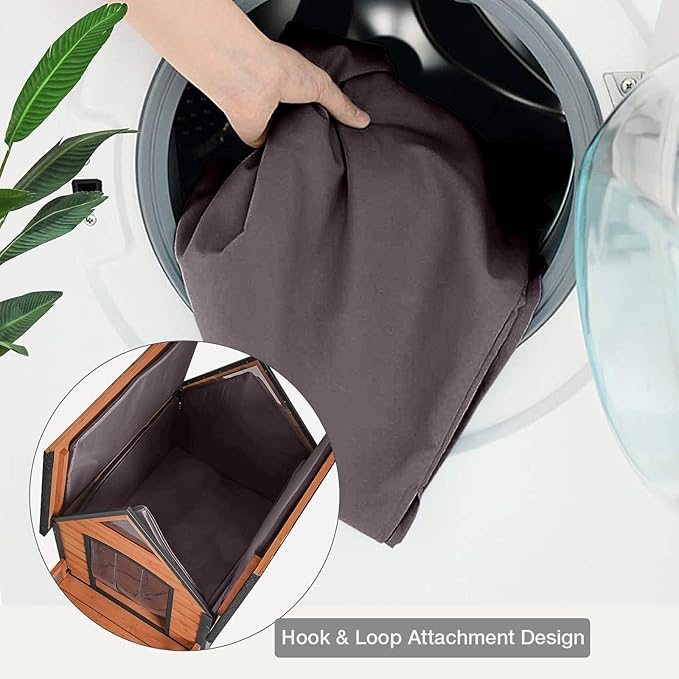 - Weather & Water Resistant: Dog house's made of 100% nature Fir wood with security waterproof paint, raised floor with customized plastic waterproof feet pad & asphalt roof & high quality curtain provide protection from the elements and keep the cabin comfortable & dry. Perfect for indoor and outdoor use.