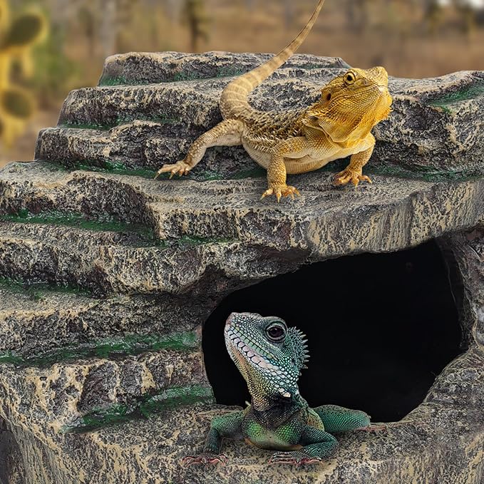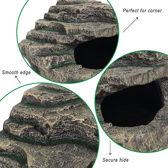 - MIMIC NATURE LOOKING: Our large reptile hide, such as the snake hide and lizard hides, also humid hide for leopard gecko, are designed to mimic natural habitats. Essential for crested gecko tank accessories and leopard gecko tank accessories ensuring a healthy and engaging environment. Perfect for snake enclosure accessories and ball python tank accessories,bearded dragon basking platform.
