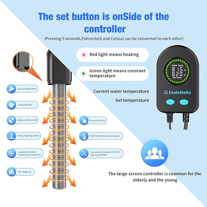 - 🐟【Smart Dual Temperature System】: Featuring a dual temperature system, this heater allows you to freely switch between Fahrenheit and Celsius by holding both buttons on the temperature controller for 2-3 seconds. The intuitive design makes it easy to monitor and adjust the temperature, catering to both beginners and experienced aquarists.