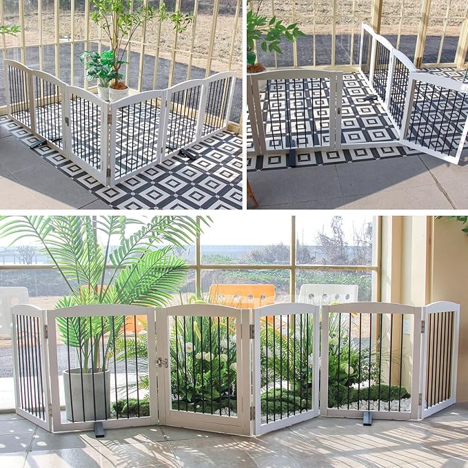 - 【Pet Gate with Door】: The pet gate Includes a lockable door . Pet gate is built with 6 separate panels, secured together with sturdy hinges allowing,Two support feet for additional balance.