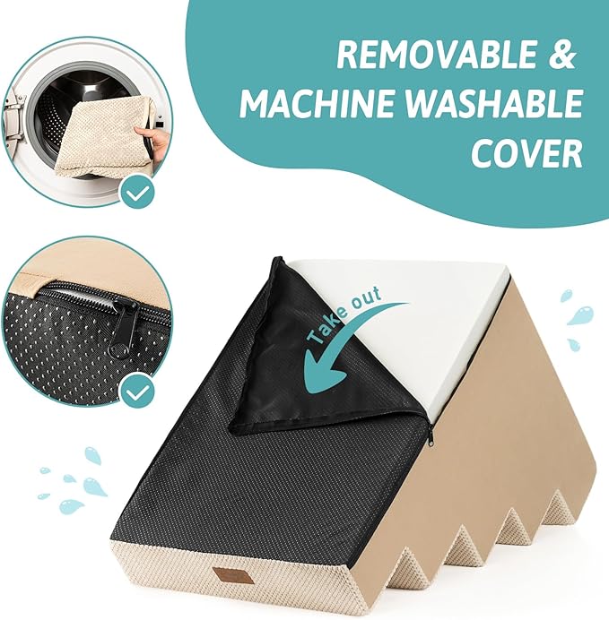 - Non-Slip Base and Removable Cover: Our dog steps for beds are equipped with a non-slip base featuring rubber dots for additional grip, minimizing movement during use. The pet steps cover is waterproof on the inner side, so you don’t have to worry about stains seeping into the foam. The outer cover is removable and machine washable for easy cleaning