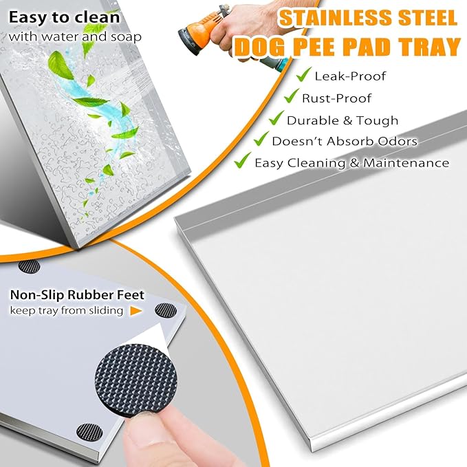 - 【Stainless Steel Tray】 This dog grass pad with Tray is made of heavy duty industrial grade 304 stainless steel, boasting a service life of 5-8 years (ordinary plastic trays typically yellow and deform within 6 months). The reinforced steel frame prevents warping, even under large dogs weighing up to 250 lbs. Compared to plastic, making it ideal for households with pets prone to skin sensitivities