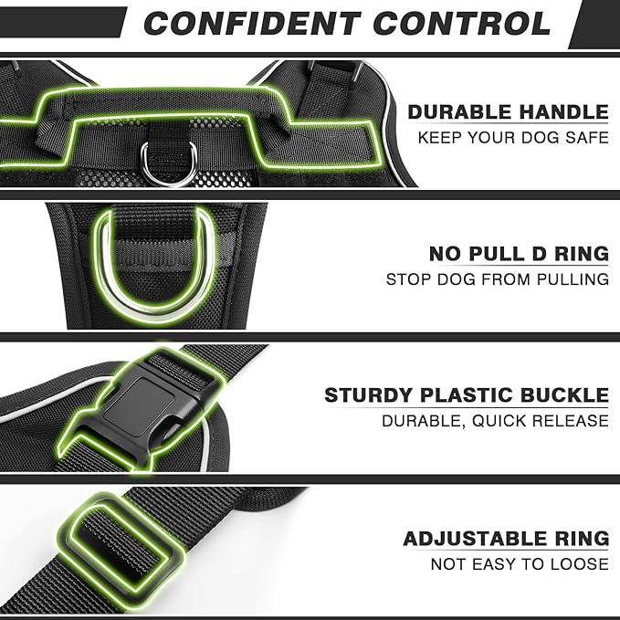 - 【4x Plastic Buckles + 2 D-rings】: Put on and take off this easy dog harness with 4 quick-release buckles from the side of the dog’s neck instead of the headwith no hassle. We also have adopted a widened design for the large dog. 2 stainless steel D-rings at the front chest and back for training, short and long leashes. This dog harness is made with military grade materials and reinforced stitching.
