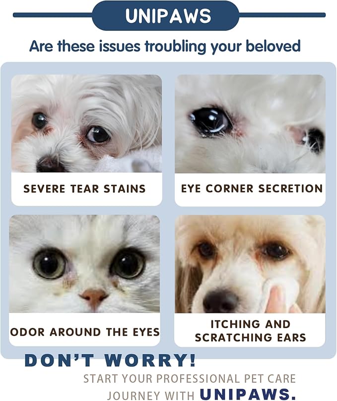UNIPAWS Dog & Cat Eye Area Cleaner with Wipes – Vet-Recommended Tear Stain Remover – 5.1 fl oz Cleaner + 50 Dry Finger Wipes – Probiotic & Plant Formula, Gentle Grooming Care