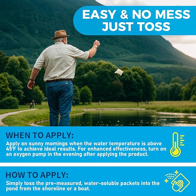 - Easy to Use: With water-soluble packaging, there’s no need for complicated measuring or mixing. Simply toss the bag into the pond and it starts working right away. It’s an effortless way to maintain water quality, saving you time and energy. Best results are achieved when the water temperature is above 45°F