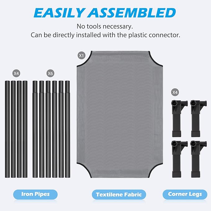 - Easy to Install: The cooling dog cot can be installed without the use of any tools, screws and can be installed directly with the plastic connector. It only takes a few minutes of your time, and presto. It's up and ready for your pet to enjoy in. Perfect for any indoor space or outdoor adventure.