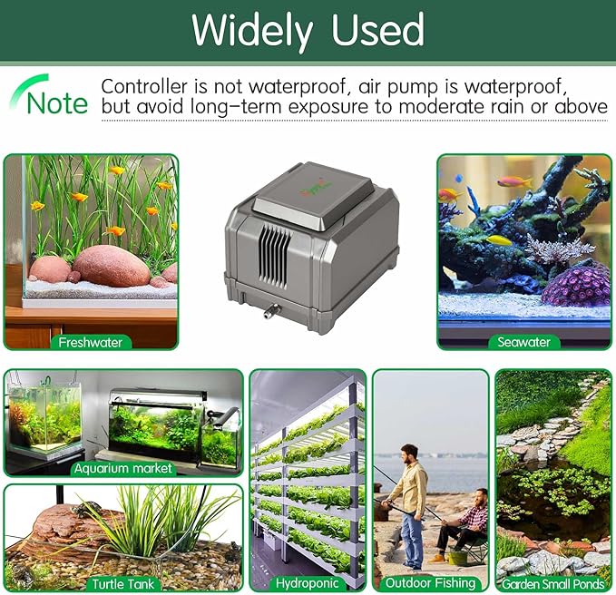 - Waterproof & Wide Use: Our fish air pump is waterproof, but it can't be exposed to moderate or heavy rain for a long time to prevent damage to the motor (Note:the controller is not waterproof). Aquarium air pump can be used for hydroponics, aquaculture, small ponds, aquariums, seafood market / restaurant and commercial use