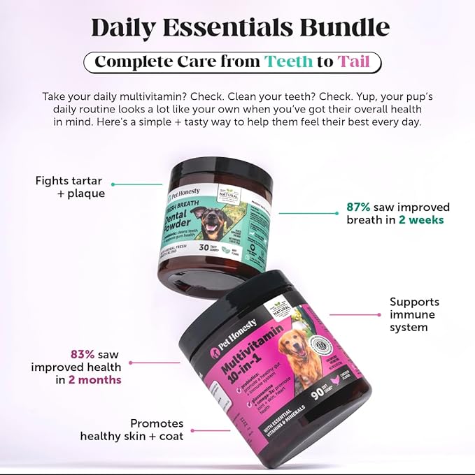 - Easy Dog Teeth Cleaning & Breath Freshener: Simplify dental care with Pet Honesty's dog dental powder. This blend of natural ingredients keep your pup’s mouth fresh and supports healthy teeth and gums. No need to rely solely on brushing - just add this tasty powder to your pup’s food for effortless dental support.