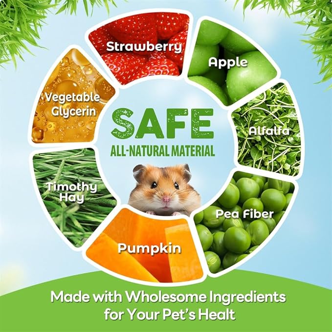 - [ Natural Materials ] : Our hamster toys are made of natural materials such as timothy grass, strawberry and apple with various flavors, which can attract pets to chew and grind their teeth better, effectively exercise pets' chewing muscles