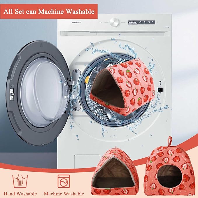 - Charming Shape Set for Versatile Comfort--This 2-piece hideout bundle includes a cozy Mongolian Tent (9.84”x9.84”x9.84”/25cm³) and a spacious Large Triangle (9.84”x9.84”x7.87”/25x25x20cm), offering pets diverse spaces to hide, nap, or explore. The playful strawberry print adds a vibrant, home-friendly aesthetic to both shapes, ensuring they complement any room or cage decor