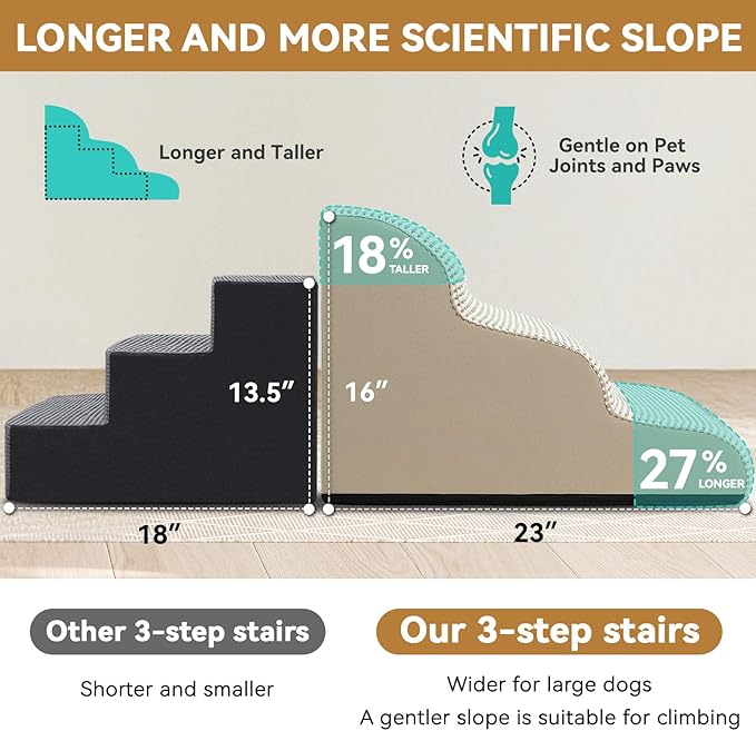 - Specific & Durable Design: Low angle slope design reduces the pressure on joints when pets jump up and down from high bed, sofa, chair and car. Portable handle makes moving stairs easily at home or taking a trip with your pet. The non-slip bottom keeps the stair firmly planted on the ground. No more worrying about your pet slipping and getting hurt! Our foam stair is an essential part of your beloved pet's life! It combines functionality, safety, and durability in one stylish package!