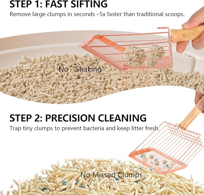- ★ High-Efficiency Sifting: This metal cat litter scoop features a dual-mesh design. The fine front screen quickly sifts out small debris, while the larger mesh effectively handles clumps of all sizes. Suitable for most litter boxes, it keeps your cat's space clean and tidy with minimal effort