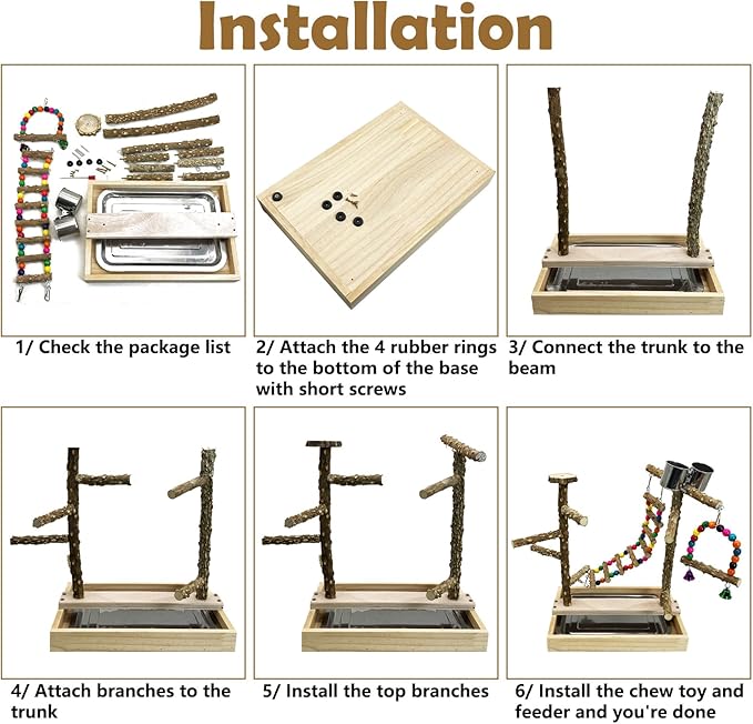 - EASY TO ASSEMBLE AND CLEAN: This wooden parrot play stand has a simple design; you can easily use screws to secure the perch; we put a small screwdriver in the package for assembly; the r-emovable tray allows for quick cleaning of droppings and debris; simply wipe the perches with a damp cloth; then let them dry in the sun; ensuring a h-ealthy and hygienic environment for your bird