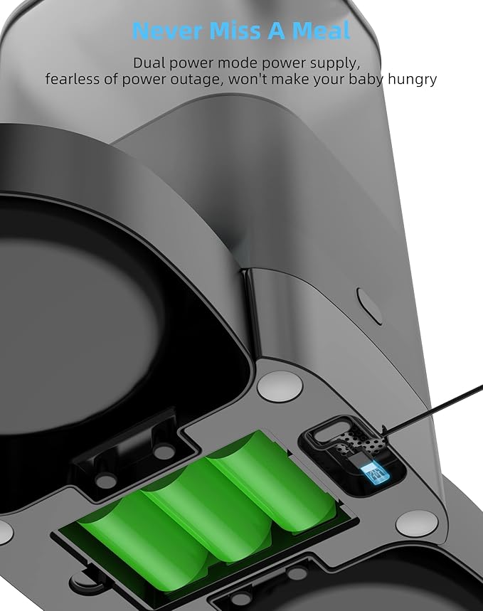 - [Dual Power Supply ] The timed cats feeder can be powered by USB power adapter and 3 alkaline D-size batteries (NOT Included). Once the feeding schedule is set, it is repeated every day. In the event of a power outage, the automatic feeder will automatically switch to battery power. For safety reasons, it is recommended to use Battery power sources. Battery alone can supply power for 200 days.No need to worry about your pet going hungry while you are away.