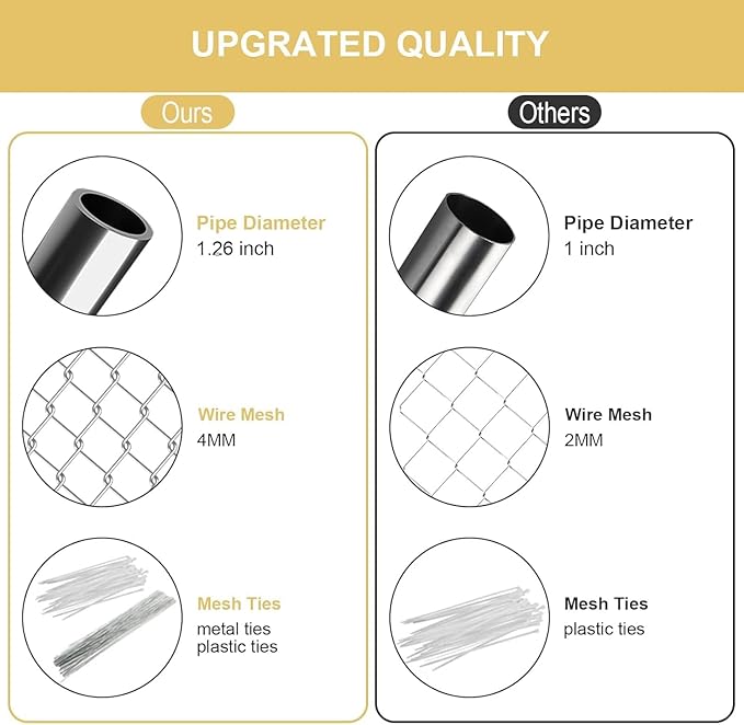 - Heavy Duty Construction:Upgraded dog houses for small to large dogs made of 1.26" galvanized steel pipe and 2.4 mm thicker steel wire mesh, solid and rust-proof, more durable than other products on the market. Round legs with hole can be inserted into both the smooth ground and soft grass outdoors to hold the cage in place for added stability