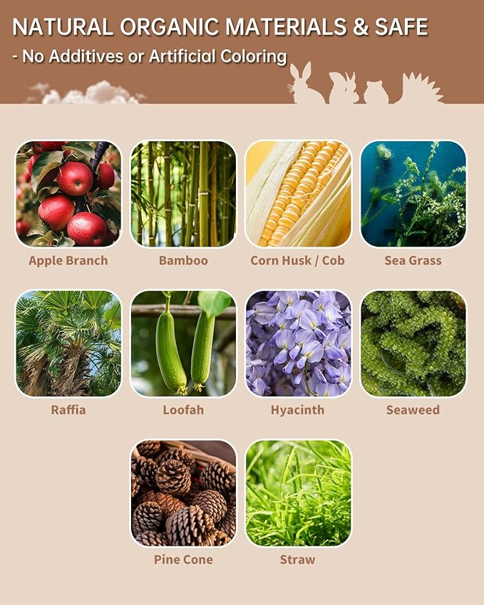- 31 Pcs Various Chew Toys: The set includes 2 Seagrass-Wrapped Sweet Bamboo Sticks, 2 Seagrass-Wrapped Apple Sticks, 1 Paper Raffia, 2 Apple Wood Blocks, 2 Sweet Bamboo Sticks, 2 Apple Sticks, 4 Corn Husks, 2 Loofah Slices, 2 Papaya Wood Sticks, 2 Seagrass Twists, 1 Woven Seagrass Carrot, 1 Corn Cob, 1 Hyacinth Ball, 1 Seaweed Ball, 1 Pine Cone, and 1 Grass Bed.