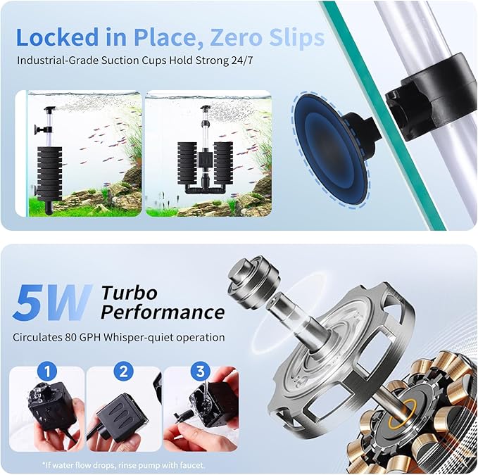 - Multi-Tank Versatility: Works in freshwater, saltwater, or turtle tanks (5W pump is reef-safe). Compact size fits 10-40 gallon aquariums, breeding tanks, or hydroponic systems. CO2-compatible for planted tanks!