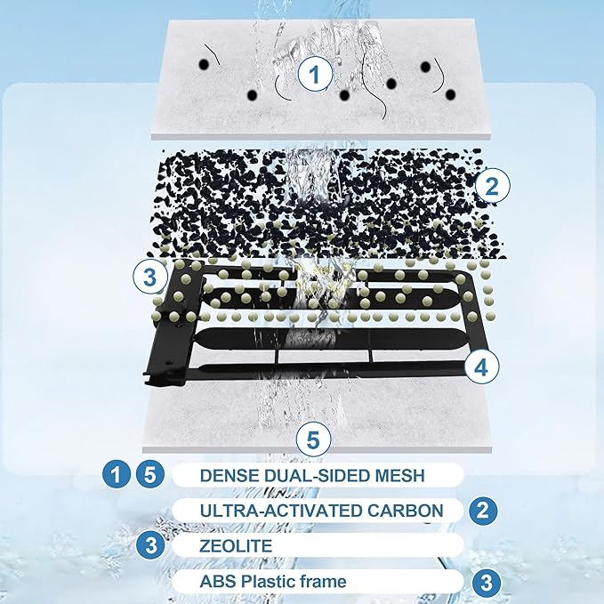 - Powerful Filtration: Dual-Sided Dense Mesh, 50% more Ultra-Activated carbon and zeolites. Our innovative dense dual-sided mesh traps debris, food particles, and waste; Ultra-activated carbon for longer-lasting, thorough filtration; zeolite filter media helps maintain the water's pH balance.