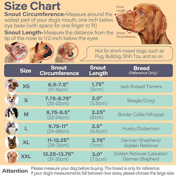 - Size XS (Cir: 6.5-7.5”, length: 1.75–2.25”) – This dog muzzle for small dogs fits Poodle, Jack Russell Terrier, etc., but not for highly anxious dogs, and short-snout dogs like Chihuahua. Measure your dog's snout circumference and length per the size chart or video. If between sizes, SIZE UP! Ensure themuzzle fits comfortably, with the nose not touching the edge.