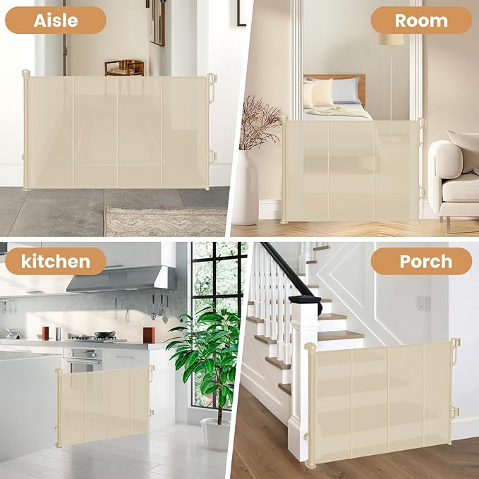 - 【Fits Your Purpose Perfectly】- The retractable baby gate is a perfect solution for providing safety and secruity space for children and pets. It is used for children and pets blocking off their way out or in. It's suitable for the kitchen, bedroom, living room, stairs, and other off-limit areas inside your home, providing a safe area for your little one. For use in both indoor and outdoor spaces.