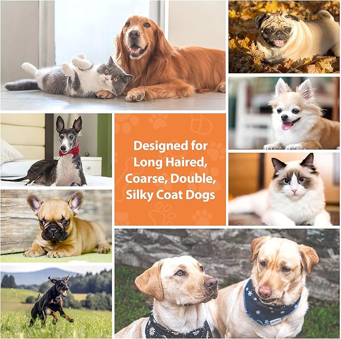 - Dog Brush and Comb Set: Deshedding dog brush features 27mm steel pins with rounded tips. Dog comb design for remove detailed matted fur, making it the perfect brushing experience for both cats and dogs. This dog&cat hair brush is nice for removing dead hair and tangles, while also giving your pet a gentle massage