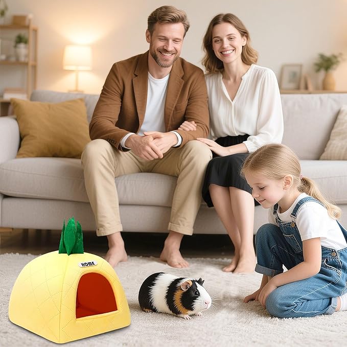 - Friendly Design: Designed in pineapple shape, the Guinea pig hidey is not easy to get dirty,very practical to use, with bright and beautiful patterns. The integrated design avoids accessories from slipping out and can also make the claws of small animals from being caught. The thickened inner cushion makes the Guinea pig bed stand upright and not easily deformed