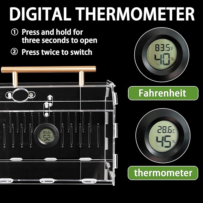 - Premium Acrylic Enclosure – Crafted from high-transparency, durable acrylic, this reptile terrarium offers a secure and visually appealing habitat for tarantulas, jumping spiders, frogs, and small reptiles. Resistant to scratches and easy to clean.