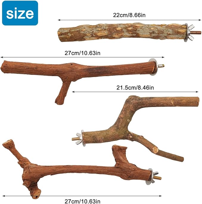 - 3 bird perches: You will receive 4 Pcs of 3 styles bird stands. The grape wood stick is about 9.7-10 inch long, with a diameter of about 0.7-1.1 inch at the bottom. The fork standing branch is about 7.8-8 inch long, and the wooden stand is about 7.8 inch long.