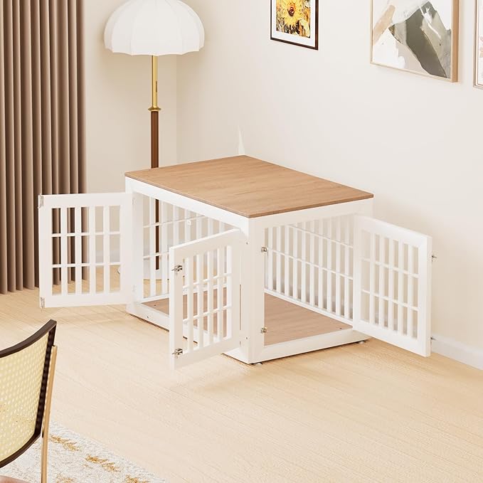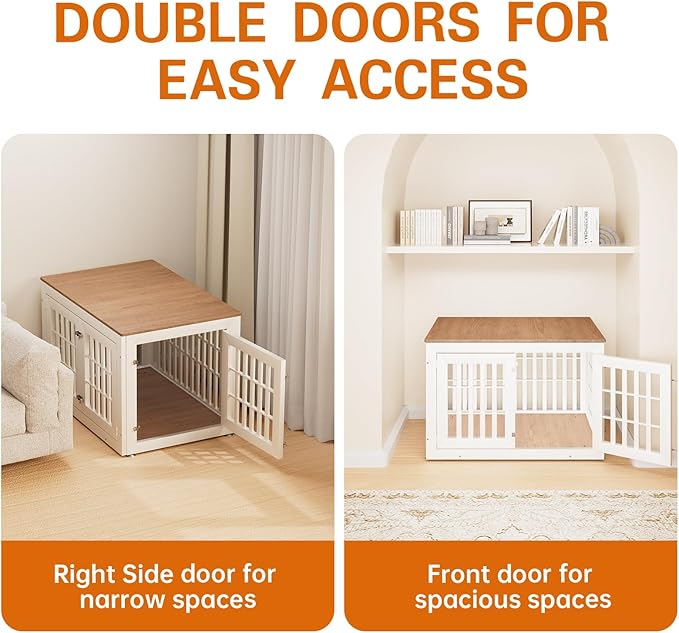 - 【Double Doors Design】The dog kennel furniture has a front door and a side door, your pet will go in and out easily with double doors. The double-doors design can adapt to more different space environments. You can decide whether to open the front door or the side door according to your needs.