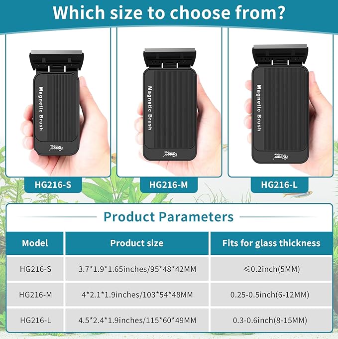 - SUPER STRONG MAGNETIC POWER: In order to obtain stronger cleaning power, the hygger aquarium glass cleaner uses N38 super strong neodymium iron boron magnets with a magnetic field strength of up to 2600GS, and the magnetism will not weaken after long-term use. S: Suitable for fish tanks with a thickness ≤0.2“. M: For fish tanks with a thickness of 0.25"-0.5". L: For fish tanks with a thickness of 0.3-0.6 inches. Permanent magnetic material, durable, providing you with consistent cleaning power