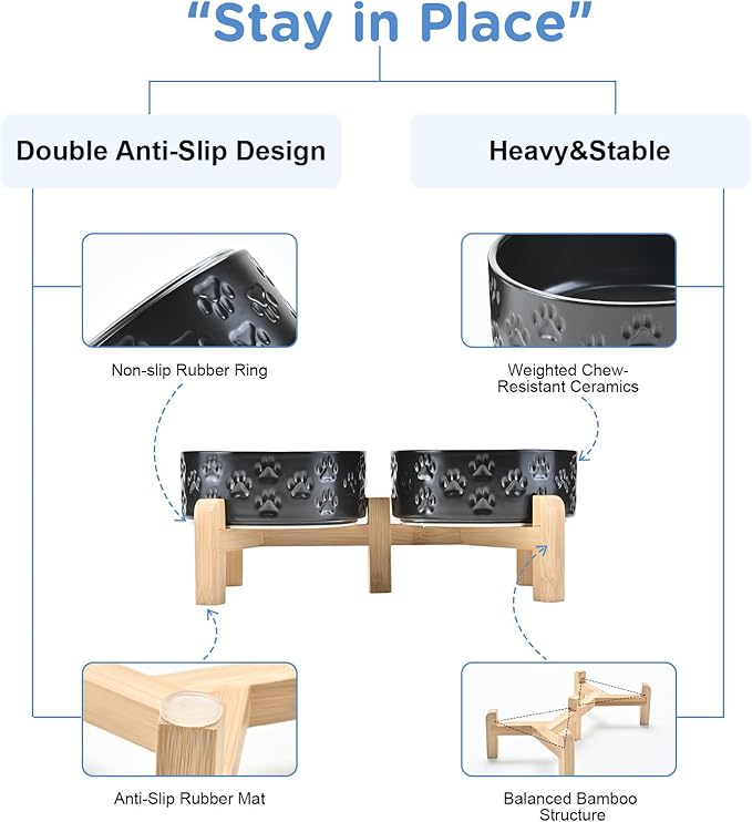 - Stable, Tip‑Resistant Design – A solid bamboo frame with Chew‑Resistant Heavyweight Ceramic, wide stance, and slip‑proof silicone pads join forces to create raised dog bowls that STAY IN PLACE on tile, wood, or laminate. Fewer spills mean cleaner floors and no accidental gouges or scratches or noisy