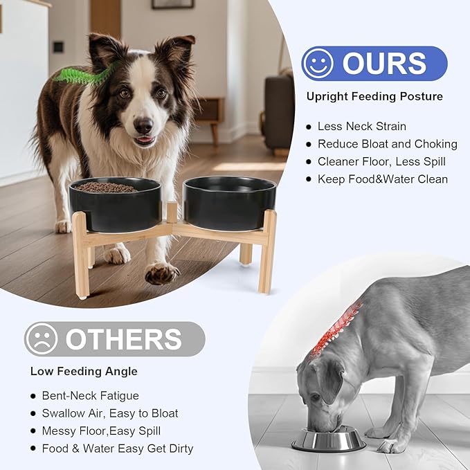 - Stable, Tip‑Resistant Design – A solid bamboo frame with Chew‑Resistant Heavyweight Ceramic, wide stance, and slip‑proof silicone pads join forces to create raised dog bowls that STAY IN PLACE on tile, wood, or laminate. Fewer spills mean cleaner floors and no accidental gouges or scratches or noisy