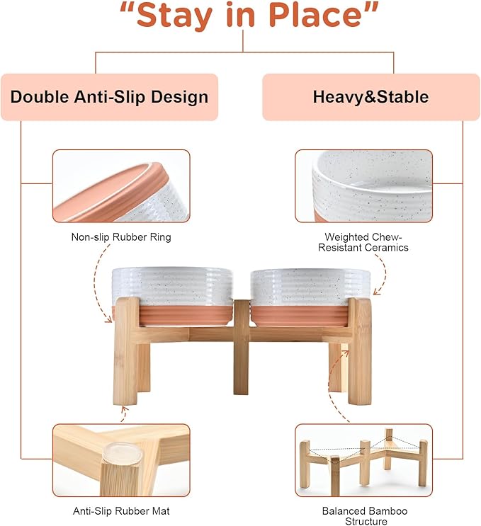 - Stable, Tip‑Resistant Design – A solid bamboo frame with Chew‑Resistant Heavyweight Ceramic, wide stance, and slip‑proof silicone pads join forces to create raised dog bowls that STAY IN PLACE on tile, wood, or laminate. Fewer spills mean cleaner floors and no accidental gouges or scratches or noisy