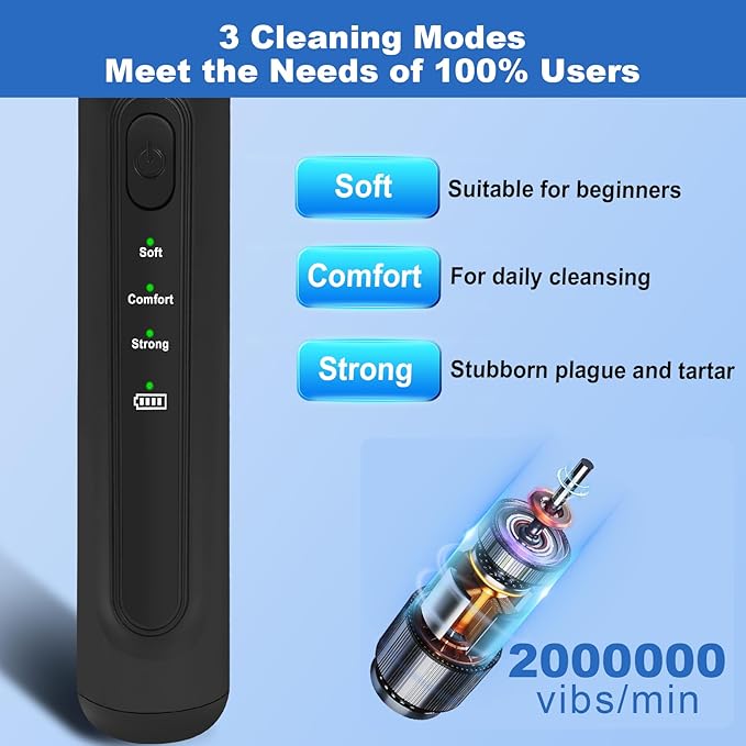 - Easy to Use & Complete Kit : Three modes (soft, comfort, strong) suit needs—start with soft for first use. A button press reduces buildup. It includes an ultrasonic cleaner, 2 heads, a dental probe, and a wrench for home care