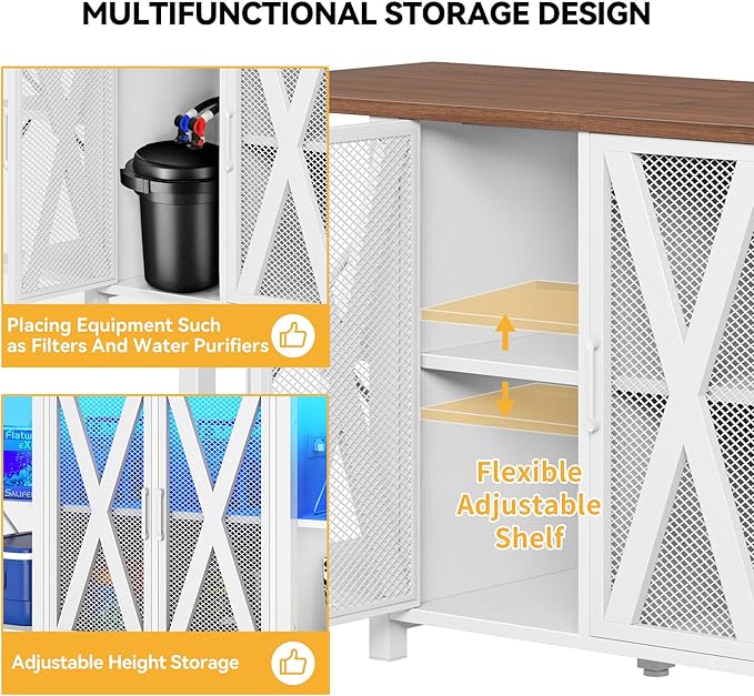 - Gorgeous LED Lights: Our aquarium stand is equipped with LED lights featuring RGB capabilities, both on the cabinet and above the smaller fish tank stand. This allows you to adjust the lighting of your aquarium according to your mood, creating any desired illumination