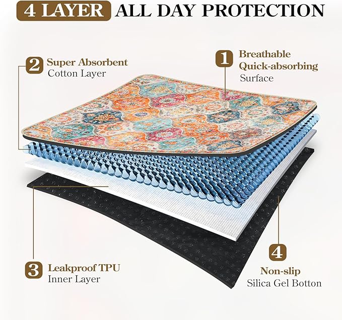 - Ultra Absorbent and Leakproof: Featured a soft, fast-absorbing top layer and a high-density core that locks in moisture on contact. The waterproof TPU backing provides superior leak protection, keeping your floors and furniture clean and dry