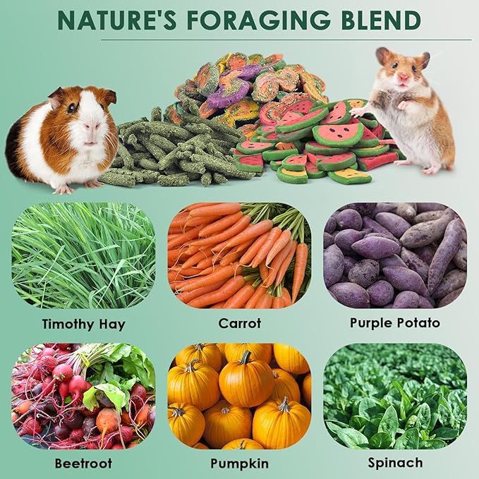 - NATURAL RABBIT TREATS: Made of carrot, timothy grass, purple potato, pumpkin, beetroot and spinach, through high temperature baked into multi-taste of hardness snacks, provide a better role in teeth grinding.