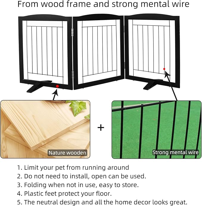 - 【Simple and Firm】This convertible wooden dog gate is a pet fence, room divider, and pet pen all in one. It combines wood and electroplated steel bars. Equipped with non - slip rubber feet, it protects your floor.