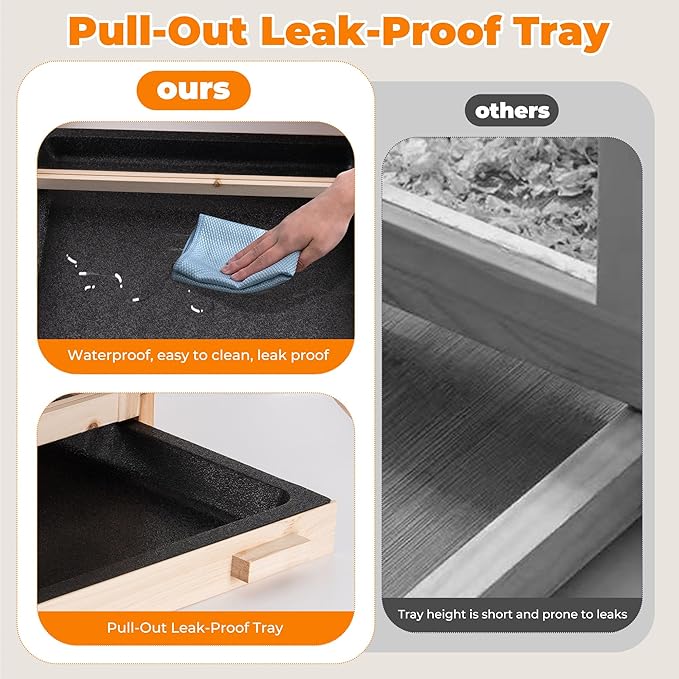- 【Leak proof tray】:Our hamster cage features a pull-out tray with a urine-resistant design, making cleaning a breeze. Say goodbye to unpleasant odors and hello to a clean and hygienic home for your pet