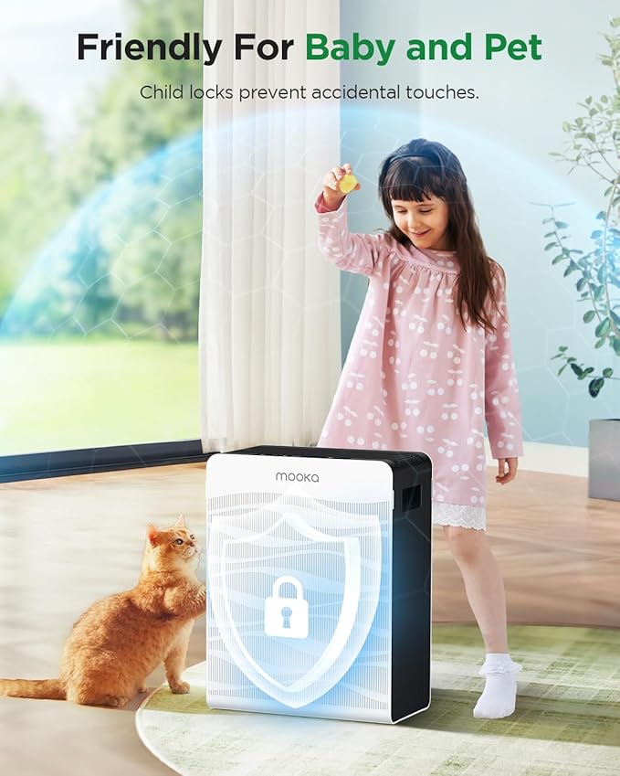 - [Essential Oil Diffuser & Child/Pet Lock]: As one of the air purifiers for home pets, it includes a fragrance box for adding essential oils, blending clean air with soothing aromas. The safety lock prevents accidental tampering by kids or pets, making it a secure choice for households