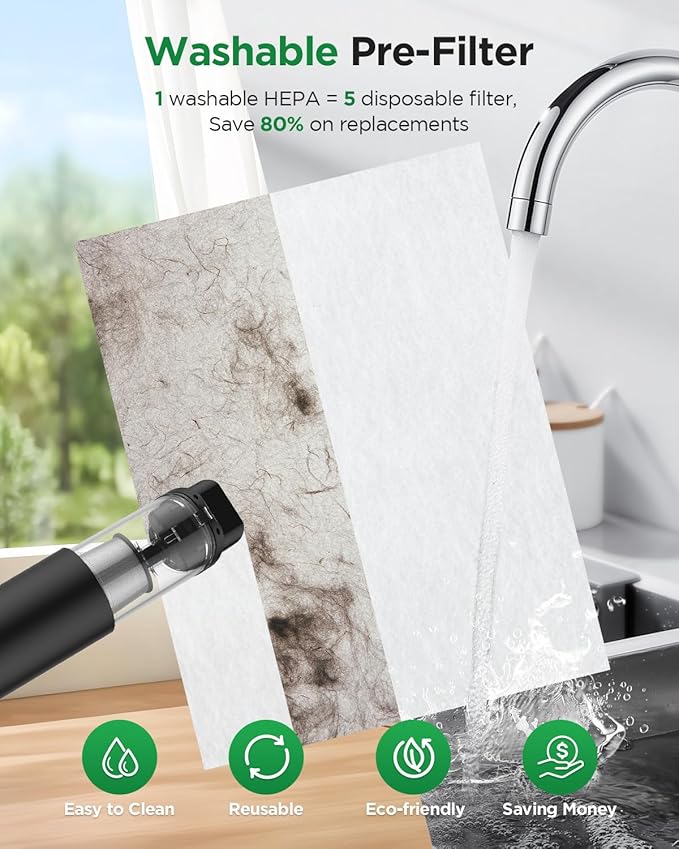 - [2 Washable Pre-Filters & Filter Replacement Alert]: Designed for convenience, this HEPA air purifiers for home includes 2 reusable pre-filters that trap dust, pet hair, and dander, prolonging the main filter’s lifespan. A smart indicator alerts you when it’s time for a replacement, guaranteeing consistent performance