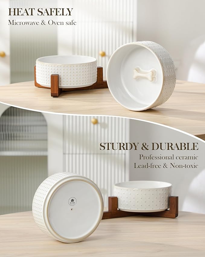 - š¦“ćELEGANT DESIGNćFeaturing embossed Rhombic and Polka Dots patterns, paired with a stylish walnut wood stand for elevated dining. These ceramic dog bowls combines classic and modern styles to enhance its visual appeal. The cleverly designed dog bone-shaped decoration at the bottom adds both beauty and fun.