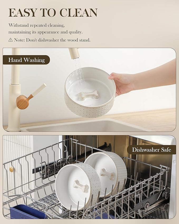 - š¦“ćEASY MAINTENANCEćThe ceramic bowls can be easily removed from the wooden stand for quick cleaning and convenient refilling. Featuring an active glaze finish, they are dishwasher safe and easy to clean by hand. Microwave safe as well, these bowls allow you to warm up your pet's food whenever needed.