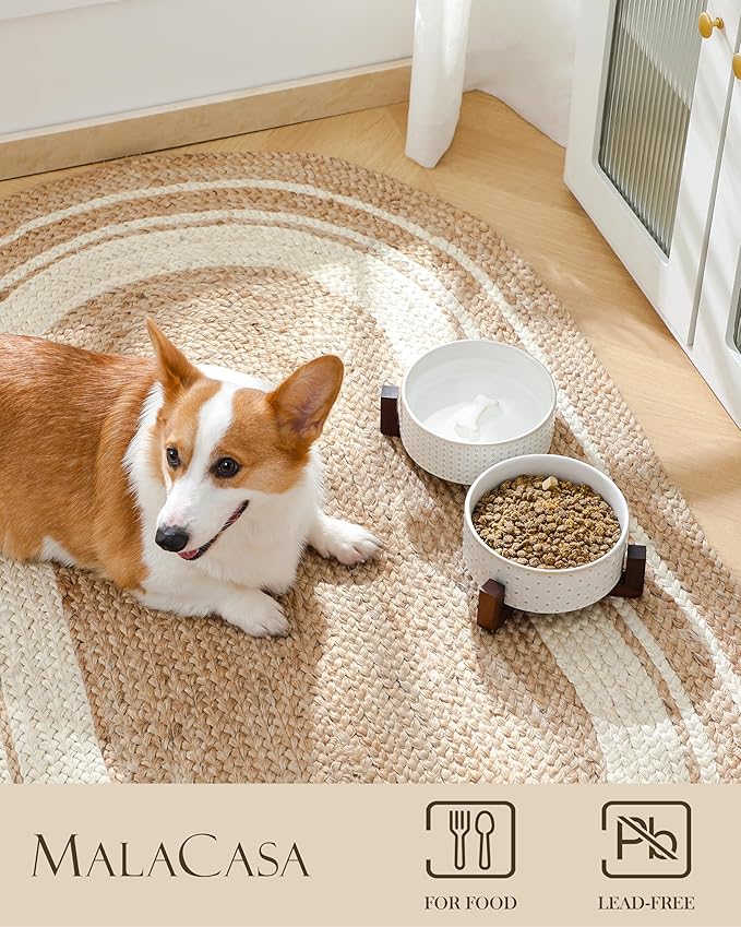 MALACASA Dog Bowl Set with Walnut Wood Stand, 3.5 Cups Ceramic Pet Bowls for Puppy Dogs, Dual Food and Water Bowls with Weighted Non-Slip Base, Basic Bowls for Your Dog or Cat, Rhombic & Polka Dots